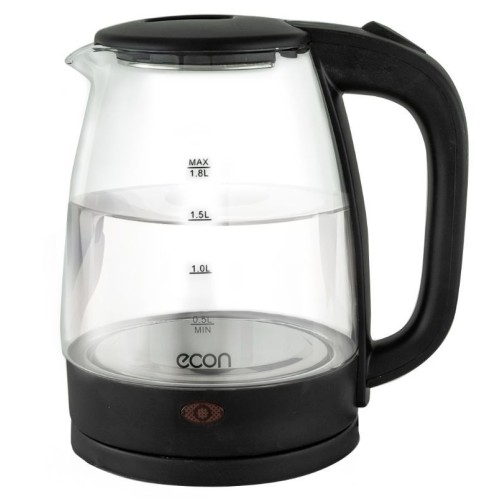Чайник стеклянный, дисковый нагревательный элемент, емкость 1,8 литра, мощность 1500 Вт, индикация включения, автоматическое отключение при закипании, защита от включения без воды, цвет корпуса: черный
