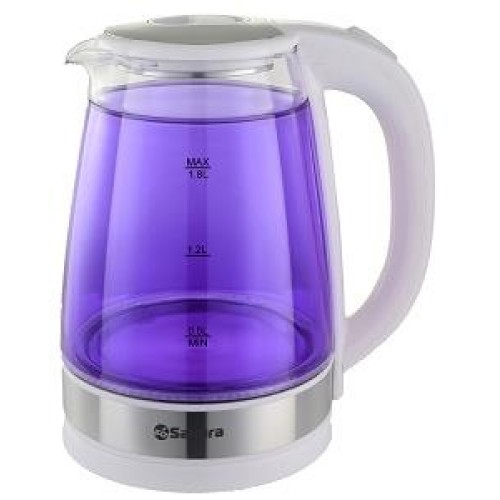 1,8 л, 1500-1800 Вт, двухслойный корпус (стекло внутри, полупрозрачный цветной пластик снаружи), диск, вращение на 360°, точечная подсветка, отключение при закипании и включении без воды, индикатор работы. Длина шнура 0,6м.