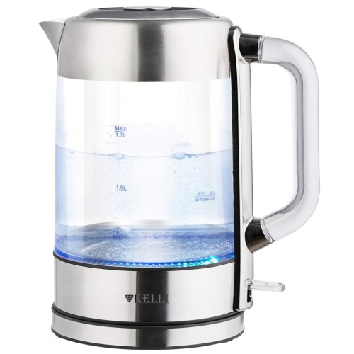 Cтеклянный чайник; Объем: 1.7 л; Мощность: 1850-2200 Вт; Термостойкое боросиликатное стекло; Внутренняя подсветка; Поворачивающийся корпус 360°; Автоматическое отключение; Шкала уровня воды; Эргономичная ручка; Удобный носик чайника; Защита от перегрева; Закрытый нагревательный элемент; Сеть: 220-240В, 50-60Гц
