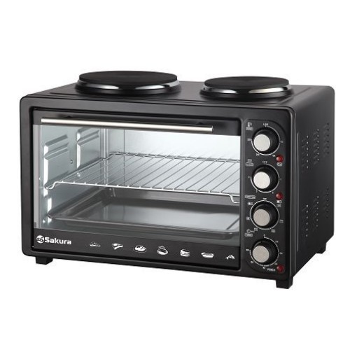 Объем 23 л, мощность 3080 Вт, мощность духовки 1380 Вт, механическое управление, 3 режима работы духовки, 2 чугунные конфорки 1000Вт+700 Вт (диаметр 145 мм), раздельная регулировка температуры духовки и конфорок (плавная). Комплектация: металлическая решетка, противень и ухват. Цвет черный