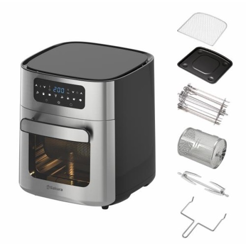 Аэрогриль; Цвет черный / стальной; Мощность: 1700 В; Объем 12 л; 8 программ приготовления; Регулировка температуры и таймер; Сенсорное управление; 6 аксессуаров в комплекте (поддон для сбора масла, решетка, сетчатая корзина, ручка для извлечения корзины, вертел, шашлычница на 10 шампуров); Готовит без масла или с минимальным его использованием; подходит для всех блюд, которые готовятся в духовке; Длина шнура: 80см