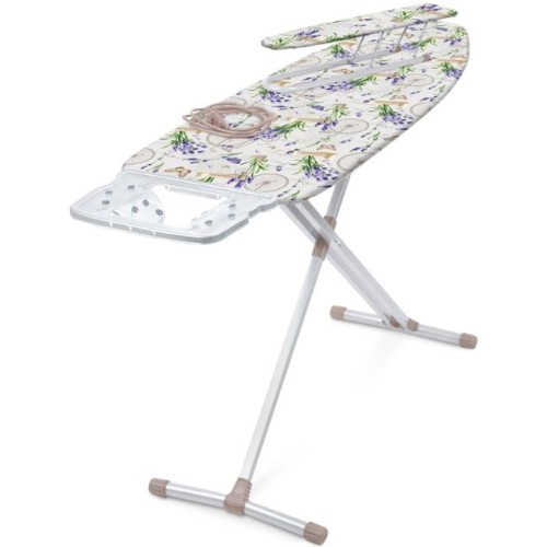 Размер рабочей поверхности 122х40см.Надёжная металлическая поверхность с отверстиями для пара Съёмный чехол из хлопка Плавно регулируемая высота до 0,9 м Подставка под утюг с термоустойчивыми вставками Переносной подрукавник Электрический соединитель 1,6 м Устойчивые опоры с пластиковыми наконечниками для защиты напольного покрытия Фиксация в сложенном виде Максимальная нагрузка на гладильную поверхность - 25 кг