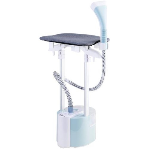 Отпариватель; Мощность: 2100 Вт; Съемный резервуар для воды: 1,8 л; До 65 минут непрерывной работы; Две металлические телескопические стойки; Готовность к работе через 45 секунд после включения; Два режима подачи пара: 25г/мин и 40г/мин; Максимальная температура пара: 100 °C,; Высота в собранном виде: 1,55м; Гибкий шланг для подачи пара; Длина шнура питания: 1,7м; Размер устройства в упаковке: 420*310*325мм; В комплекте: отпариватель, гладильная доска, термостойкая защитная рукавица, универсальная насадка для отпаривания, съемная щетка для насадки, 2 металлические телескопические стойки, плечики для одежды; Цвет: белый / голубой