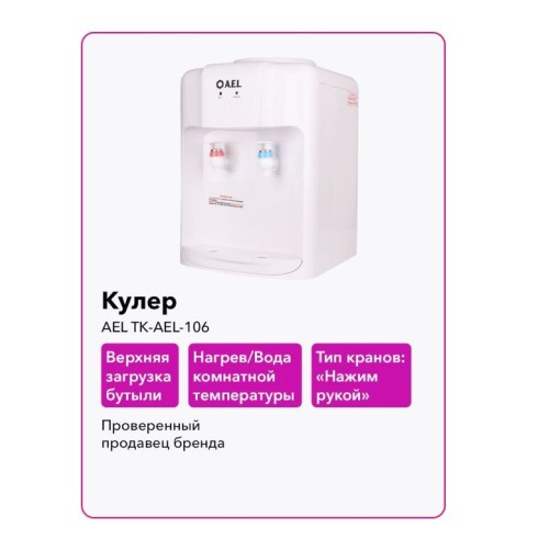 AEL TK-AEL-106 Настольный кулер для воды с верхней загрузкой бутыли без функции охлаждения. Нагревательный элемент в аппарате мощностью 550 Вт позволяет за час получить до 5 л горячей (90-95 градусов) воды. Имеет компактные размеры, благодаря чему легко устанавливается на стол или тумбочку не загромождая пространство. Оснащен двумя механическими кранами типа "нажим рукой" для подачи горячей воды и воды комнатной температуры. Корпус изготовлен из высококачественного пищевого пластика. Кулер подходит как для домашнего, так и для офисного использования, на предприятиях и учреждениях.