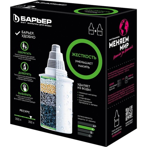 Количество в упаковке 2 Ресурс, л 350 Проблема воды Жесткая вода Тип очищаемой воды Питьевая водопроводная Срок хранения, мес 36 Размеры упаковки, ДхШхВ 129x64x146мм Срок хранения, мес 36 Вес, кг 0.3 Очищает воду от солей жесткости, которые мы привыкли встречать в жизни в виде накипи в чайнике, кофе-машине и налете на кухонном кране. Кассета БАРЬЕР Жесткость снижает образование накипи, а также удаляет основные вредные примеси, оставляя только свежую чистую воду. Ресурс каждой кассеты — 350 литров. С фильтрами БАРЬЕР вам не придется запоминать размер или диаметр сменной кассеты: любая кассета БАРЬЕР подходит ко всем фильтрам-кувшинам БАРЬЕР. А герметичное резьбовое соединение исключает попадание неочищенной воды в отфильтрованную. Ресурс зависит от качества исходной воды, но составляет не более 350 литров для каждой кассеты.