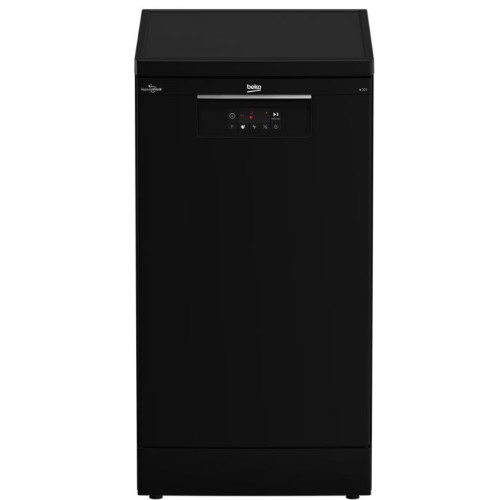 Отдельностоящая посудомоечная машина, 45см, универсальный мотор, LED дисплей, кнопочное управление, 5 программ, 10 комплектов, регулировка верхней корзины по высоте, конденсационная сушка, защита от протечек, уровень шума 49дб, черный