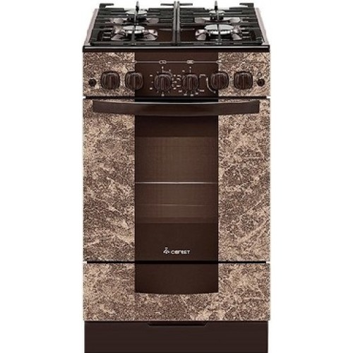 Габариты (ШхГхВ) 50х58,5х85 см. 4 газ. горелки. Электророзжиг горелок стола. Гриль горелка. Решетки горелок стола чугунные. Механический таймер. Полезный объём духовки: 52 л. Газ-контроль духовки. Вертел с электроприводом. Направляющие духовки: проволочные. Термоуказатель. Выдвижной ящик для посуды и принадлежностей. Без крышки. Фасад стеклянный с рисунком "мрамор" коричневый, варочная поверхность: стеклянная.