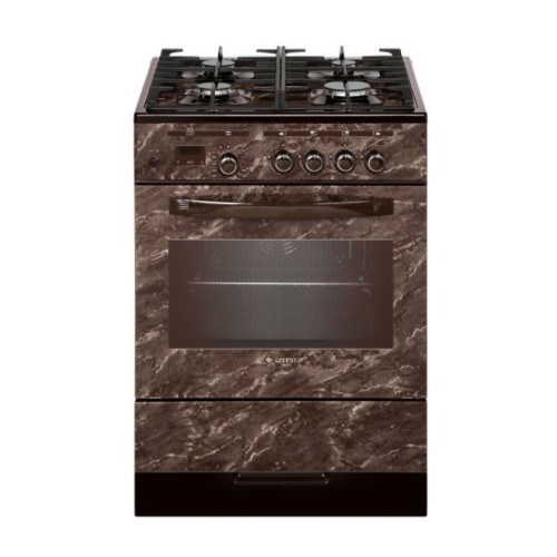 Газовая плита. Цвет: коричневый с рисунком "мрамор". Варочная поверхность стеклянная. Габаритные размеры ШхГхВ: 60х60х85см. Полезный объём духовки: 52 л. Фасад стеклянный. Варочная поверхность стеклянная. Без крышки. Вертел с электроприводом. Выдвижной ящик для посуды и принадлежностей. Газ-контроль горелок стола. Газ-контроль духовки. Гриль. Ножки регулировочные. Подсветка духовки двойная. Съемные проволочные направляющие духовки. Таймер сенсорный. Терморегулятор (термостат). Чугунные решетки горелок стола. Электророзжиг горелок, встроенный в ручки. Электророзжиг духовки, встроенный в ручку.