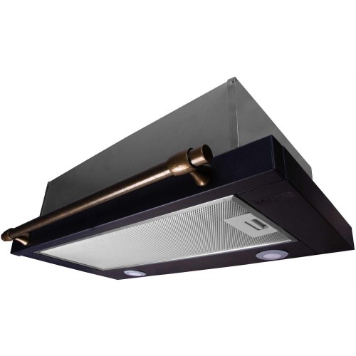 Встраиваемая вытяжка в выдвижным экраном в ретро дизайне,ширина 60 см, 3 режима, механическое управление, 650 м3/ч., алюминиевые жировые фильтры, LED освещениe - 2 лампы, ур.шума 57дб, рейлинг в цвете бронза, цвет - черный