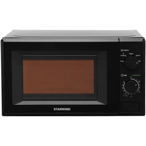 Микроволновая печь Starwind SWM5820 привлекает к себе внимание современным дизайном, корпус черного цвета подойдет для любого стиля интерьера. Оборудование имеет довольно простую конструкцию и компактные размеры. Использовать его можно как дома, так и в офисе. Бытовая техника поможет во время обеденного перерыва быстро подогреть еду. В домашних условиях микроволновую печь удобно использовать для размораживания продуктов, полноценного приготовления различных блюд. Мощность устройства составляет 700 Ватт. Внутренняя часть имеет объем в 20 литров, покрытие у нее из эмали, которая легко и быстро чистится. Управлять бытовым прибором необходимо с помощью поворотных рукояток, позволяющих установить нужно время нагрева и температуру.