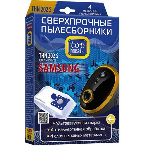 TOP HOUSE THN 202 S Сверхпрочные нетканые пылесборники с антибактериальной обработкой, 4 шт. для пылесосов SAMSUNG, VITEK, BORK, HOTPOINT-ARISTON, GORENJE, MIDEA, ARIETE, BIMATEK, ROLSEN, BEKO, DIRK DEVIL/ROYAL, REDMOND, SCARLETT, SINBO, VAX, ZANUSSI, DAEWOO, PRINCESS. Соответствуют оригинальным типам пылесборников: VP-95B и VP-77. Изготовлены из многослойного нетканого материала Micro-Fleece на одном из лучших заводов в Германии - Aichner-Filter GmbH. Обеспечивают уровень фильтрации воздуха в 99,98%.