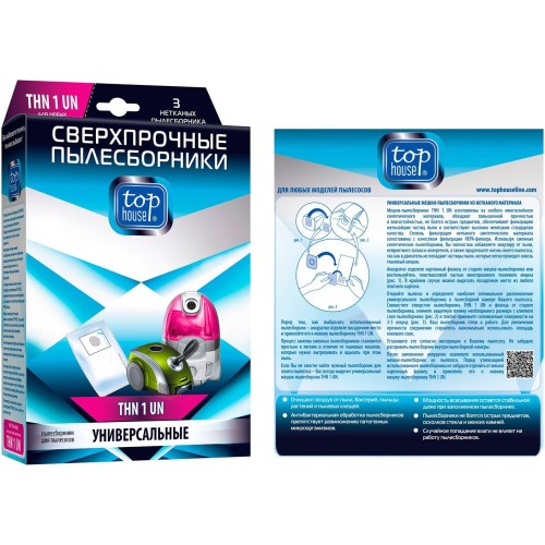 TOP HOUSE THN 1 UN Сверхпрочные нетканые пылесборники "Универсальные", 3 шт. Многослойные, особопрочные, с увеличенной степенью фильтрации. Для пылесосов любых марок и моделей.
