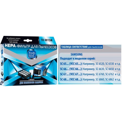 TOP HOUSE TH 001SM HEPA-Фильтр для пылесосов SAMSUNG: SC 65.., SC 66.., SC 67.., SC 68.., 1 шт. HЕРА-Фильтр TOP HOUSE изготовлен в Германии из специального материала. Высокая степень фильтрации НЕРА-Фильтра позволяет очистить воздух от бактерий, пыльцы растений, спор плесени и пылевых клещей. Размер отфильтрованных частиц 0,0003 мм, что в 233 раза тоньше человеческого волоса.