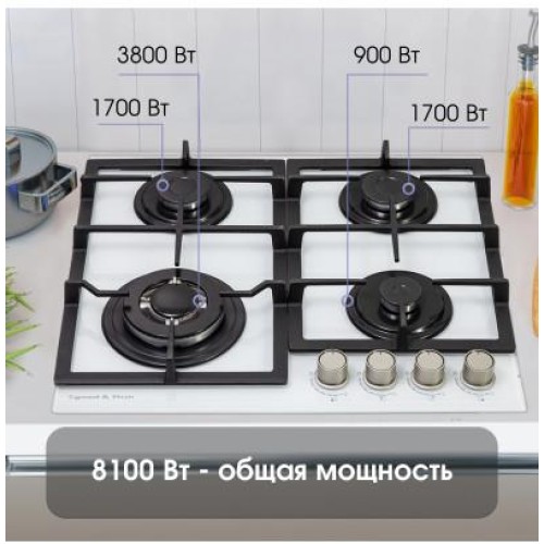 Газовая варочная панель. 4 конфорки. Управление фронтальное. Переключатели поворотные. Материал поверхности: закаленное стекло. Материал решеток/крышек горелок: чугун. Общая мощность: 8100 Вт. Газ-контроль. Электроподжиг на каждой ручке. WOK-конфорка. Адаптер для вока. Адаптер для кофе. Переходники для разных типов газа: для газа G30/30mbar в комплекте. Габариты (ШхГхВ): 580*520*52 мм. Длина шнура питания - 900 мм. Цвет: Белый.