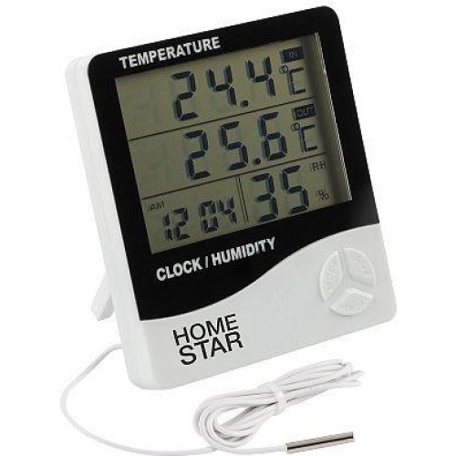 Электронный термометр-гигрометр Выносной проводной датчик 3 показателя Показатель 1: t в помещении °C Показатель 2: t на улице °C Показатель 3: относительная влажность в помещении % Часы Будильник Диапазон измерения t: от -20°С до +70°С Погрешность: +/- 1° Цена деления: 0,1°С Диапозон измерения относительной влажности: 10%-99% Работа от батарейки 1ААА (не входит в комплект) Возможно настенная или настольная установка Упаковка: блистер