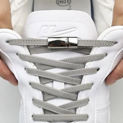 Плоские эластичные шнурки С магнитным фиксатором Длина: 100 см, ширина: 8 мм цвет: серый Материал: полиэстер, латекс, магнит, пластмасса Упаковка: пакет, хэддер Подходят для любой обуви, экономят время. обладают отличной эластичностью и прочностью, поэтому обувь можно надевать и снимать, не развязывая шнурки. Магнитный замок на шнурках имеет высокую магнитную силу, обеспечивая надежное удержание обуви на ноге.