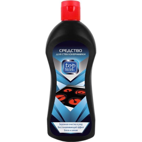 TOP HOUSE Средство для чистки твердых поверхностей, 320 мл. специально разработано для чистки и ухода за плитами и варочными панелями со стеклокерамическим покрытием. Содержит мягкий абразив и натуральное эфирное масло апельсина. Благодаря специальному компоненту убирает микроцарапины и придает блеск