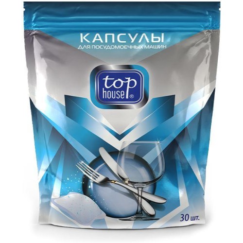 TOP HOUSE Капсулы для посудомоечных машин, 30 шт. Эффективное средство, предназначенное для удаления стойких загрязнений. Капсулы удобны и безопасны, не содержат фосфатов, триазолов и отдушек. Удаляют пригоревшие и засохшие загрязнения, жиры и крахмал. Предупреждают образование известкового налета. Капсула в водорастворимой пленке – нет контакта кожи с содержимым капсулы. Быстро растворяются и бережно очищают посуду и столовые приборы.