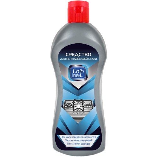 TOP HOUSE Средство для нержавеющей стали, 320 мл. Незаменимо для чистки поверхностей плит, духовок, СВЧ-печей, утюгов, чайников, соковыжималок и других бытовых приборов из металла и нержавеющей стали. Легко удаляет жир, грязь, пятна от воды, нагар с утюгов. Мягко полирует и восстанавливает блеск.