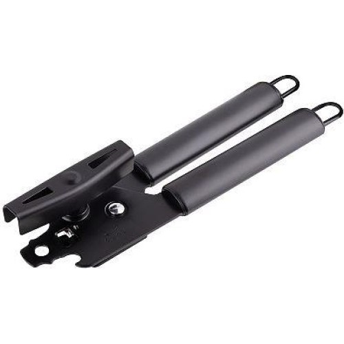 Нож консервный CLASSICO NERO из нержавеющей стали, цвет - черный, non-stick (раб часть) Материал: ручка из нерж стали, раб часть - железо, лезвие из нерж стали, размер: 20*5*4,4 см. картонная подложка. Овальная ручка.