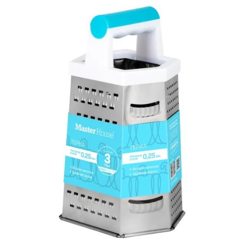 Терка шестигранная. Материал корпуса – нержавеющая сталь, материал ручки - пластик (HIPS-ударопрочный полистирол). Полировка – зеркальная. Толщина стенок – 0,25 мм. Высота – 22,5 см. Основание – 13,5 x 11,5 см.