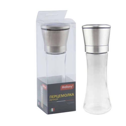 Перцемолка ручная Предназначена для ручного помола крупной соли и всех видов перца горошком. Размеры: 6.5*19 см, 285 гр, объем 185 мл Материалы: стекло, нерж сталь 201 жернова — грубая керамика Упаковка: ПВХ коробка, цветной вкладыш Регулировка степени помола не рекомендуется мыть в посудомоечной машине, чистить щеточкой.