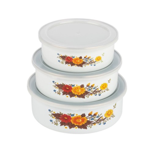 Набор из 3 эмалированных мисок с крышками, FAMILIA, объемы: 600/850/1250 мл, цвет: белый с дизайном Материал: углеродистая сталь, 2 слоя эмали, нерж сталь (ободок), крышка из полипропилена; прямой формы, внутри и снаружи белые с народным дизайном. Размеры: 14*5,3 см — 600 мл; 16*5,5 см — 850 мл; 18*6,35 — 1250 мл. Упаковка: ЦВЕТНАЯ КОРОБКА. Толщина 0,78 мм. *Не рекомендуется мыть в посудомоечной машине, мыть теплой водой с мягким моющим средством. Назначение: для хранения продуктов. Рекомендовано хранение продуктов в холодильной камере.