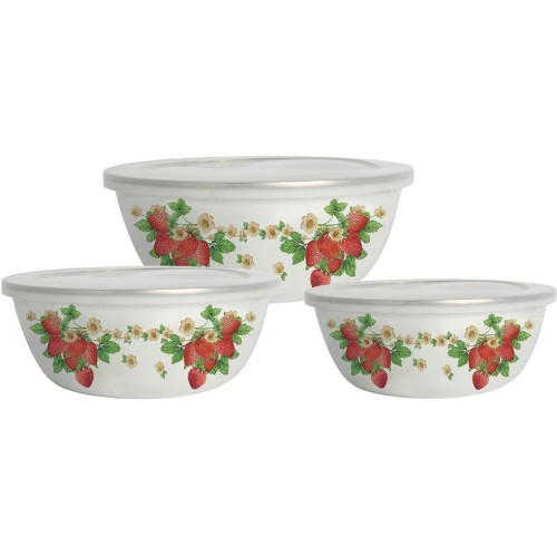 Набор мисок, 6 предм. (3 МИСКИ С КРЫШКАМИ: 0,85 Л (d16 см), 1,4Л (d18 см), 2,6 Л (d20 см) с внутренним эмалированным покрытием), эмалированная сталь, внешнее покрытие - эмаль с рисунком.