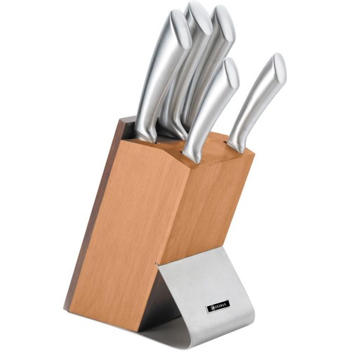 Набор ножей 6 предметов. Лезвие ножей из высококачественной нержавеющей стали: (нож поварской - 2,5mm/8", нож для хлеба - 2,5mm/8", нож разделочный -2,5mm/8", нож универсальный - 2,0mm/5", нож для овощей – 2,0mm/3,5", деревянная подставка для ножей.