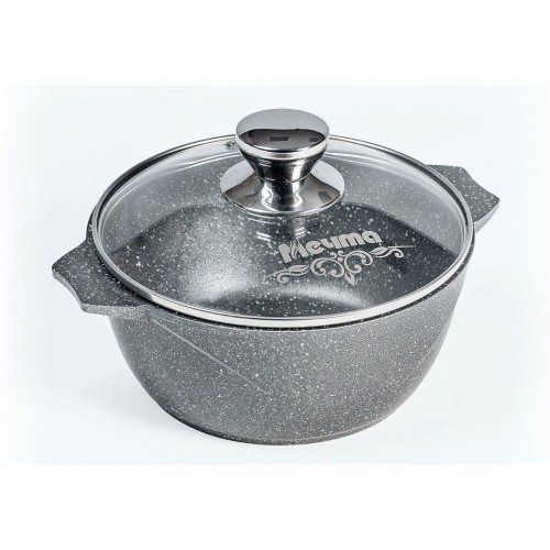 Кастрюля 4л. со стеклянной крышкой. Антипригарное покрытие Greblon на водной основе без PFOA. Серия "Гранит". Подходит для всех типов плит, кроме индукционных. Можно использовать в посудомоечной машине. Ресурс более 12 000 циклов, толщина покрытия до 55 мкр. Толщина дна 5,5-6мм., толщина стенок 3,6-4мм. Покрытие Greblon позволяет готовить с минимальным количеством масла, сохраняя вкусовые и полезные свойства продуктов. Литой толстостенный корпус не подвержен деформации, а утолщенное дно равномерно распределяет тепло по всей поверхности.