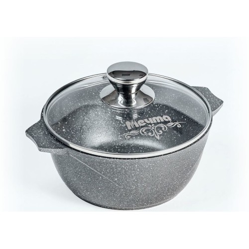 Кастрюля 6л. со стеклянной крышкой. Антипригарное покрытие Greblon на водной основе без PFOA. Серия "Гранит". Подходит для всех типов плит, кроме индукционных. Можно использовать в посудомоечной машине. Ресурс более 12 000 циклов, толщина покрытия до 55 мкр. Толщина дна 5,5-6мм., толщина стенок 3,6-4мм. Покрытие Greblon позволяет готовить с минимальным количеством масла, сохраняя вкусовые и полезные свойства продуктов. Литой толстостенный корпус не подвержен деформации, а утолщенное дно равномерно распределяет тепло по всей поверхности.