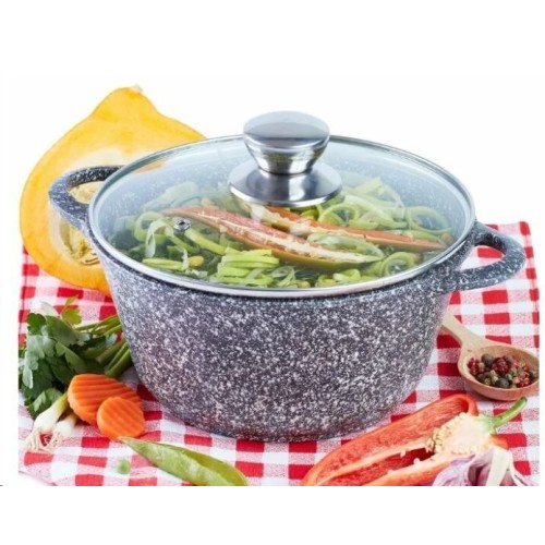 Объем, л./размер, см: 3.0л. 24см Материал: литой алюминий Коллекция/серия: Мрамор Торговая марка: Традиция Толщина дна: 6 Толщина стенок: 4 Источник тепла: Все виды плит, кроме индукционной Тип упаковки: цветная коробка Крышка: стеклянная Внутреннее покрытие: антипригарное покрытие Pfluon Внешнее покрытие: антипригарное покрытие Pfluon