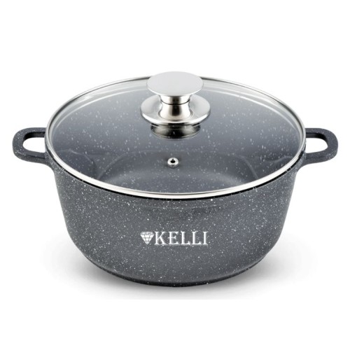Кастрюля с мраморным антипригарным покрытием. Объем: 2,5 л. Диаметр: 20 см. Индукционное дно. Материал: алюминий. Жаропрочная стеклянная крышка с паровыпуском. В комплекте силиконовые насадки на ручки. Пригодна для всех видов плит.