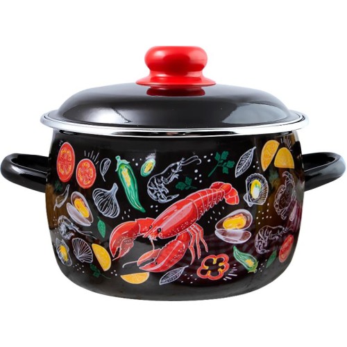 Необычная, яркая контрастная деколь с изображением морепродуктов на черной эмалированной посуде станет заметным акцентом на современной кухне. Наблюдение за изображениями лобстеров и морепродуктов может стать источником вдохновения для кулинарных экспериментов, создания новых рецептов и приготовления блюд, которые доставят удовольствие и радость. Посуда создана из экологичного природного сырья и соответствует стандартам ГОСТ, что гарантирует отсутствие химических реакций и сохраняет вкус пищи при приготовлении. Стекловидное эмалированное покрытие надежно предохраняет металл основания от контакта с продуктами. Изделия подходят для всех видов плит: газовых, электрических и индукционных.