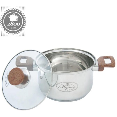 Корпус прямой формы с гравированным логотипом. Материал: нержавеющая сталь марка 201 Стеклянная крышка с загнутыми краями в форме буквы С с шелкографическим логотипом. Бакелитовые ручки «софт тач» цвета дерева Бакелитовая ручка на крышке «софт тач» цвета дерева Зеркальная полировка внутри и снаружи Внутри мерная шкала Дно со штампованным логотипом. Дно 0,5мм алюминий + 1,5 мм железо + 0,5 мм алюминий, с одной степенью защиты Подходит для индукционных плит