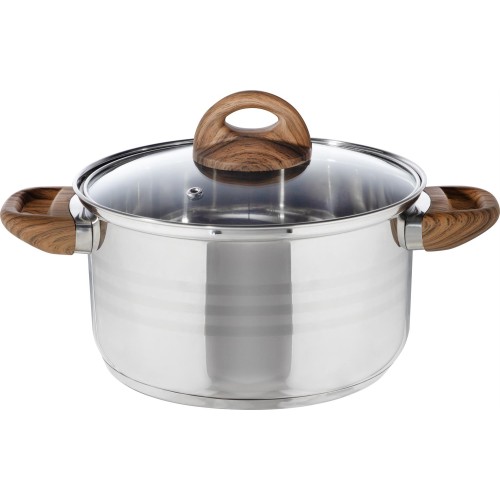 Кастрюля, FORESTA, объём: 3,5 л из нержавеющей стали с крышкой с ручками под дерево soft-touch Материал: нерж сталь, жаропрочное стекло, алюминий, сталь, бакелит, силикон. Объем: 3,5 л. Толщина стенок: 0,4 мм. Размер: 20*11,5 см. Дно: 3-слойное капсулированное (1 мм алюминия, сталь база для индукции). Подходит для всех типов плит. Полировка: внутри - зеркальная, снаружи - смешанная. Отметки литража. Крышка из жаропрочного стекла с отверстием для выпуска пара С -тип. Ручки - бакелитовые, с покрытием под дерево. Цветная коробка+пакет.
