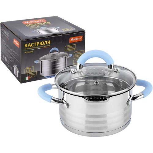 Кастрюля 1,8 л MELODIA из нержавеющей стали, с крышкой-дуршлагом и 2-мя носиками для слива. Размер: 16*9 см. Объем: 1,8 л. Нерж сталь, толщина стали: 0,5 мм. 5-слойное капсулированное дно, подходит для всех типов плит. (0,5 мм алюминий+1 мм железо + 0,5 мм алюминий + сталь база). Снаружи: смешанный дизайн. Внутри: зеркальная полировка + отметки литража. Крышка-дуршлаг из жаропрочного стекла с отверстиями разного диаметра 3 и 6 мм с двух сторон + отверстие для выпуска пара в стекл части. Толщина стекла: 3,8 мм.Ручки: стальные полые с покрытием из силикона. Цветная коробка. Толщина дна: 2,9 мм.