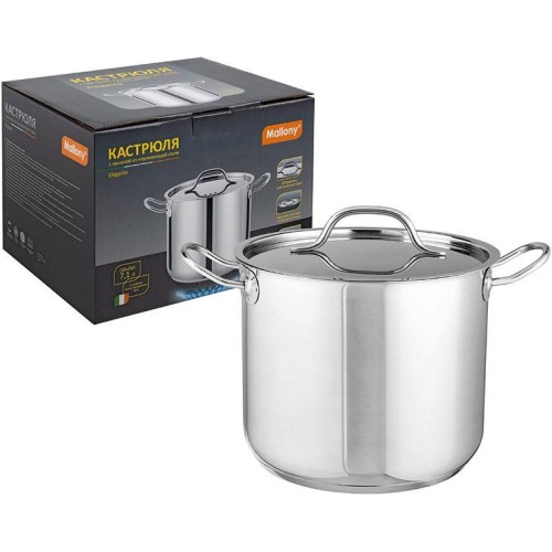 Кастрюля 7,1 л, Elegante, из нержавеющей стали со стальной крышкой Размер: 22*19 см. Объем: 7,2 л. Нерж сталь, толщина стали: 0,5 мм. 5-слойное капсулированное дно, подходит для всех типов плит. (0,5 мм алюминий+1 мм железо + 0,5 мм ал.юминий + 430 сталь база). Снаружи/Внутри: зеркальная полировка + внутри -отметки литража. Крышка плоская стальная G-типа. Ручки: стальные витые. Цветная коробка+пакет для крышки+пакет для кастрюли + прокладка между крышкой и кастрюлей из пенополистирола+мануал.