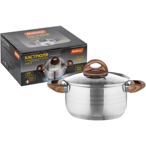 Кастрюля, FORESTA, объём: 2,5 л из нержавеющей стали с крышкой с ручками под дерево soft-touch. Материал: нерж сталь, жаропрочное стекло, алюминий, сталь, бакелит, силикон. Объем: 2,5 л. Толщина стенок: 0,4 мм. Размер: 18*10,5 см. Дно: 3-слойное капсулированное (1 мм алюминия, сталь база для индукции). Подходит для всех типов плит. Полировка: внутри - зеркальная, снаружи - смешанная. Отметки литража. Крышка из жаропрочного стекла с отверстием для выпуска пара С -тип. Ручки - бакелитовые, с покрытием под дерево. Цветная коробка+пакет.