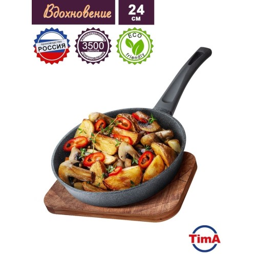 Сковороды изготовлены из пищевого алюминия современным методом литья с кристаллизацией под давлением и покрыты усиленным двухслойным антипригарным покрытием «Greblon Non Stick C2+» (Германия) толщиной около 30 мкм. Это покрытие выдерживает не менее 3,5 тысячи условных циклов приготовления пищи, что позволяет сковороде прослужить несколько лет. Увеличенная толщина дна (до 5 мм) и высокие стенки (55 – 65 мм) сковород позволяют не только жарить или разогревать различные блюда, но и тушить. Фиксированные эргономичные ручки с покрытием Soft-touch, не нагреваются. Сковороды серии «Вдохновение» изготовлены в современном дизайне, имитирующем камень, оригинально и стильно смотрятся в интерьере любой кухни.