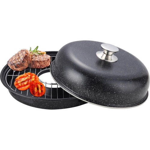 Гриль-газ с мраморным покрытием; Диаметр: 33 см; Приготовление без жира и масла; Здоровое и вкусное питание; Приготовление без дыма; Эффектное разделение тепла; Полноценный гриль в любое время года; Одновременное приготовление разных видов продуктов; Быстрое приготовление блюд; Принцип работы: 1. Установите сковородку на маленькую или среднюю конфорку, строго по рецепту; 2. Налейте в нижний поддон немного воды, либо выстелите дно паддона фольгой; 3. Установите решетку; 4. Выложите на нее продукты; 5. Зажгите газовую конфорку; Проследите, чтобы плямя не касалось сковороды; 6. Накройте гриль крышкой; Материал: углеродистая сталь