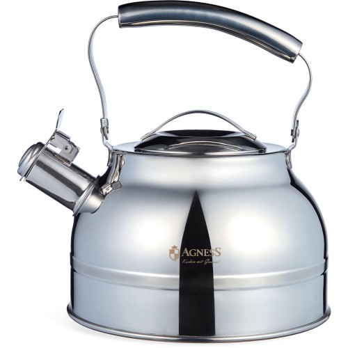 Корпус выполнен из ВЫСОКОКАЧЕСТВЕННОЙ НЕРЖАВЕЮЩЕЙ ХРОМНИКЕЛЕВОЙ СТАЛИ 18/8 • Капсульное термоаккумулирующее дно с прослойкой из алюминия Термоаккумулирующее дно ИМЕЕТ МНОГОСЛОЙНУЮ СТРУКТУРУ. В чайниках с термоаккумулирующим дном вода ЗАКИПАЕТ БЫСТРЕЕ, и дольше остается горячей. • Не содержит BPA и пластиковых элементов • Удобная складывающаяся ручка • Легко наливать воду. Используя клапан на носике чайника, вы легко сможете налить воду. Просто нажмите на клапан, чтобы открыть носик чайника. • Встроенный свисток подскажет, что вода в чайнике закипела и его пора снимать с плиты. • Стильный дизайн чайника с логотипом бренда AGNESS украсит любую кухню • Подходит для всех типов плит, включая ИНДУКЦИОННЫЕ