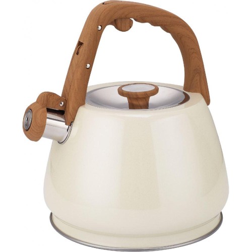Чайник со свистком, 3,0 л, нержавеющая сталь, ИНДУКЦИОННОЕ КАПСУЛИРОВАННОЕ ДНО, курковый механизм, внешнее покрытие – антипригарное цветное покрытие, устойчивое к высоким температурам, фиксированная ручка с покрытием soft-touch «под дерево».