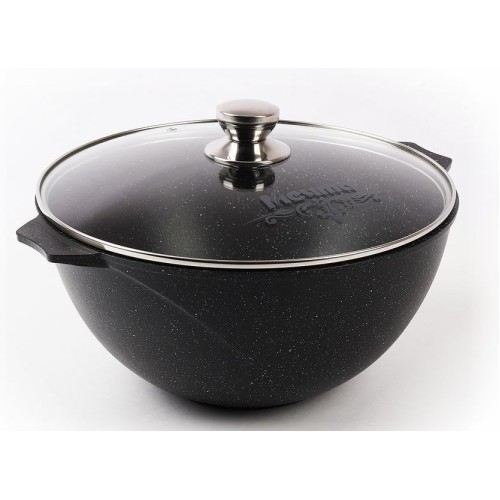 Казан для плова 5л с антипригарным покрытием и стеклянной крышкой серии "Гранит black" Подходит для всех типов плит, кроме индукционных. Можно использовать в посудомоечной машине.