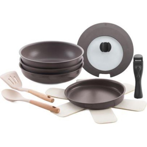 Набор посуды LARA LR01-301 сочетает в себе высокое качество, стильный дизайн и удобство, делая готовку более приятной и комфортной. Набор в коричневом цвете включает четыре сковороды (универсальную, глубокую, блинную, вок), съемную ручку, крышку, лопатку