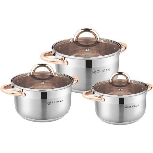 Набор посуды, 6 предм. (3 КАСТРЮЛИ С КРЫШКАМИ: 2.7 Л (d18 см ), 3.8 Л (d20 см ), 6.4 Л (d24 см ), нержавеющая сталь, 5-ти СТЕПОВОЕ КАПСУЛИРОВАННОЕ ДНО, цветная стеклянная крышка с ручкой «ПОД ЗОЛОТО», ручки на корпусе «ПОД ЗОЛОТО», внутренняя – зеркальная полировка корпуса, снаружи – комбинированная полировка корпуса.