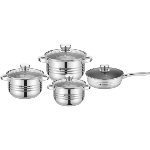 Набор посуды, 8 предм. ((3 КАСТРЮЛИ С КРЫШКАМИ: 2.0 Л (d16 см ), 3.0 Л (d18 см ), 4.0 Л (d20 см ), СКОВОРОДА С КРЫШКОЙ И АНТИПРИГАРНЫМ ПОКРЫТИЕМ – 3,0 Л (d26х5,5см) нержавеющая сталь, 5-ти СТЕПОВОЕ КАПСУЛИРОВАННОЕ ДНО, крышки - стекло, внутри - зеркальная полировка корпуса, снаружи -комбинированная полировка корпуса.