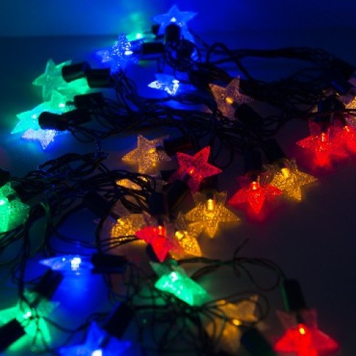 FUNRAY SE-STARS-540M (Звездочки) Гирлянда светодиодная 5M, 40LED, мульти (4цв.), гирлянда со световыми элементами декоративной формы в виде звездочек, длина изделия составляет 5 метров, количество светодиодных ламп 40 шт, питание от сети 220В, цвет свечения мульти: синий, красный, зеленый, желтый, не имеет контроллера, цвет шнура темно-зеленый, гирлянда имеет степень защиты IP20 - защита от твердых частиц размером от 12 мм.