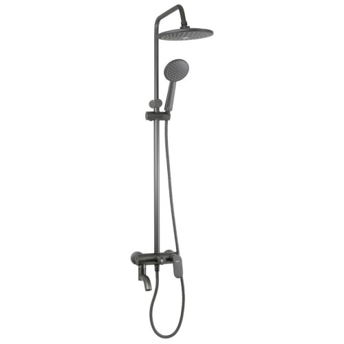 Смеситель + стойка душевая телескопическая "тропический душ" с двумя лейками в ванную / душевую комнату, из авиационного алюминия под "графит". Смеситель шаровый с дивертором м/к на корпусе с коротким поворотным изливом, душевым шлангом и лейкой. Картридж d = 40 мм, ручка литая, аэратор для экономии воды, чашки и эксцентрики. Душевая, регулируемая по высоте стойка с присоединением к корпусу смесителя и дополнительным креплением к стене и большой круглой лейкой с эффектом тропического душа. Габаритные размеры: ширина смесителя 150 мм, высота 150 мм, длина излива корпуса 135 мм, длина излива стойки 300 мм, высота телескопической стойки от 850 - 1150 мм, душевая лейка d = 115 мм, лейка тропический душ d = 230 мм, шланг 150 см. Вес - 4,000 кг, объём - 0,0314 м3. В Комплекте корпус с изливом, чашки, эксцентрики, прокладки, стойка, шланг, две лейки, крепления.