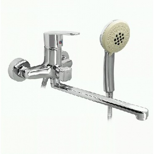 Смеситель хромированный в ванную / душевую комнату, с длинным плоским изливом, шаровый, с дивертором м/к на корпусе. Материал изготовления — ЦАМ (цинк-алюминий-медь). Картридж d = 40 мм, литая ручка, аэратор для экономии воды, чашки и эксцентрики. Габаритные размеры: ширина 150 мм, высота корпуса 160 мм, длина излива 300 мм, двухрежимная душевая лейка d = 100 мм, шланг 150 см. Вес - 1,800 кг, объём - 0,00823 м3. В комплекте паспорт, корпус с изливом, дивертор, душевая лейка, шланг, кронштейн, комплект крепежа и прокладок. Габаритные размеры коробки: ширина 325 мм, высота 105 мм, глубина 155 мм.
